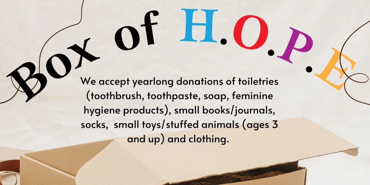 We accept donations and items throughout the year to build our individual Boxes of H.OP.E. We have partnered with two schools in remote areas of Ghana, that lack easy access to basic resources. We want to fill these children with added hope about what the future holds for them.